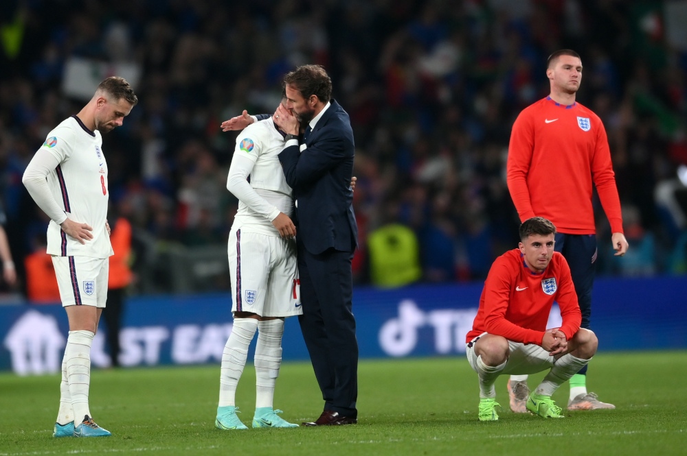 Στη φωτογραφία ο προπονητής της Εθνικής Αγγλίας παρηγορεί ποδοσφαιριστές του μετά τον αγώνα με την Ιταλία.