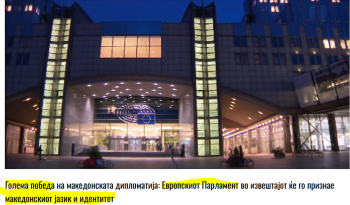 Μια μεγάλη νίκη για τη διπλωματία της Βόρειας Μακεδονίας με επικεφαλής τον πρωθυπουργό Μίτσκοσκι – το Ευρωπαϊκό Κοινοβούλιο θα εδραιώσει και θα επιβεβαιώσει την ύπαρξη της μακεδονικής ταυτότητας και γλώσσας σε επίσημο έγγραφο, αναφέρουν τα τοπικά ΜΜΕ.