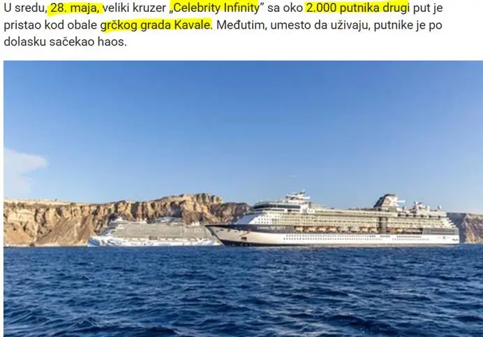 Την Τετάρτη 28 Μαΐου, το μεγάλο κρουαζιερόπλοιο «Celebrity Infinity» με περίπου 2.000 επιβάτες έδεσε για δεύτερη φορά στα ανοικτά των ακτών της ελληνικής πόλης της Καβάλας. Ωστόσο, αντί να διασκεδάσουν, οι ταξιδιώτες αντιμετώπισαν χάος κατά την άφιξή τους, γράφει η σερβική Blic.