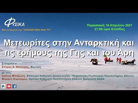 Τι είναι μετέωρα και τι μετεωρίτες; Ποια η σχέση των μετεωριτών με τα πεφταστέρια και τις εντυπωσιακές βολίδες; Που και πως δημιουργούνται οι μετεωρίτες; Πως έρχονται στον πλανήτη μας; Πως τους εντοπίζουμε και πως βεβαιωνόμαστε ότι πρόκειται για τέτοιους και όχι για γήινα αντικείμενα; Πέφτουν μετεωρίτες στην Ελλάδα; Πόσα είδη μετεωριτών υπάρχουν και ποια είναι η σύσταση κάθε τύπου; Ποια είναι η σημασία τους για τη σύγχρονη επιστήμη; Τι μας αποκαλύπτουν; Τα παραπάνω και για άλλα πολλά θα αποτελέσουν το αντικείμενο της εκπομπής ΦΥΣΙΚΑ της Παρασκευής 16 Απριλίου 2021, στις 9 μμ ώρα Ελλάδας, η οποία θα έχει ως τίτλο “Μετεωρίτες στην Ανταρκτική και τις ερήμους της Γης και του Άρη”. Ο Φυσικός Σπύρος Κάνουρας θα συζητήσει με δύο ειδικούς επί του θέματος· τον Επίκουρο καθηγητή Ορυκτολογίας – Πετρολογίας του Γεωπονικού Πανεπιστημίου Αθηνών Ιωάννη Μπαζιώτη και τον Ομότιμο καθηγητή του Πανεπιστημίου του Σικάγου και συνεργάτη της NASA σε αποστολές στο Ηλιακό μας σύστημα, Θανάση Οικονόμου. Ο κ. Μπαζιώτης θα μας αφηγηθεί τις συναρπαστικές εμπειρίες του από τη συμμετοχή του στην 41η αποστολή Antarctic Search for Meteorites (ANSMET), την οποία η NASA έχει καθιερώσει από το 1976 για τον εντοπισμό και τη συλλογή μετεωριτών, στον παγετώνα Αμούνδσεν της Ανταρκτικής, η οποία απέδωσε 263 μετεωρίτες! Είναι ο μοναδικός μέχρι στιγμής Έλληνας που έχει συμμετάσχει σε τέτοια αποστολή. Ο κ. Οικονόμου θα μας εξηγήσει πως εντοπίζονται μετεωρίτες στις γήινες ερήμους, τη δεύτερη σημαντικότερη πηγή μετά την Ανταρκτική. Επίσης, θα αναφερθεί σε αντίστοιχες εμπειρίες που είχε από αποστολές της NASA στον πλανήτη Άρη, όπου κινούμενα ρομπότ, εφοδιασμένα μεταξύ άλλων και με όργανο του κ. Οικονόμου για τον προσδιορισμό της σύστασης των πετρωμάτων, έχουν εντοπίσει και καταγράψει μετεωρίτες εξωαρειανής προέλευσης.