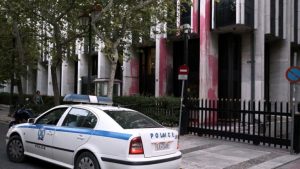 Μέλη της Αναρχικής Συλλογικότητας Ρουβίκωνας έχουν ρίξει μπογιές και τρικάκια ενώ έσπασαν και τζαμαρίες στο κτήριο του Υπουργείου Εξωτερικών στην Οδό Ακαδημίας 1, Κυριακή 22 Ιουλίου 2018. ΑΠΕ-ΜΠΕ, Συμέλα Παντζαρτζή
