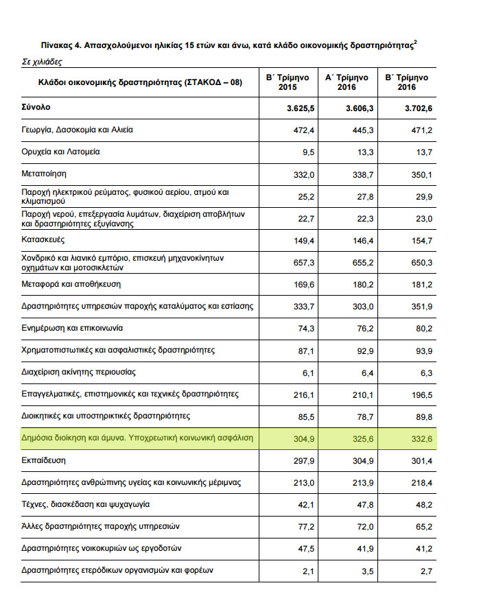 Πρώτον, την επίσημη έρευνα της ΕΛΣΤΑΤ, η οποία βρήκε ότι ο πληθυσμός των υπηρετούντων στη διοίκηση -εξαιρουμένων των εκπαιδευτικών και των υγειονομικών, πίσω από τους οποίους επιχειρεί να κρυφθεί το Μαξίμου- αυξήθηκε κατά 27.700 άτομα από το δεύτερο τρίμηνο του 2015 έως το δεύτερο τρίμηνο του 2016. Η τριμηνιαία έρευνα για την απασχόληση που κατέγραψε στον κωδικό «Δημόσια διοίκηση και άμυνα. Υποχρεωτική κοινωνική ασφάλιση», ότι οι απασχολούμενοι από 304.900 ανήλθαν στους 332.600 (όπως φαίνεται και από τον πίνακα 4 της σελίδας 6 της Έρευνας Εργατικού Δυναμικού της ΕΛΣΤΑΤ για το β’ τρίμηνο του 2016).