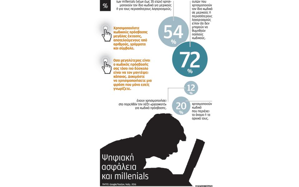 Ερευνα που διεξήγαγε η YouGov για λογαριασμό της Google καταδεικνύει ότι περισσότεροι από τους μισούς (54%) Ελληνες millennials (θεωρούνται όσοι γεννήθηκαν μετά το ’80) οι οποίοι ερωτήθηκαν χρησιμοποιούν τον ίδιο κωδικό πρόσβασης για κάποιους ή για τους περισσότερους από τους λογαριασμούς τους, κυρίως (72%) επειδή είναι δύσκολο να θυμούνται τόσους κωδικούς πρόσβασης.