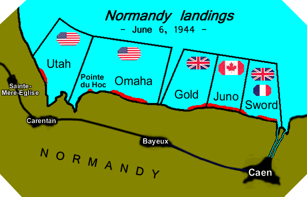 5 Ακτή UTAH (Γιούτα),4η Μεραρχία Πεζικού(ΜΠΖ) ΗΠΑ, ακτή OMAHA(Ομάχα), 1η και 29η ΜΠΖ ΗΠΑ, ακτή GOLD(χρυσός), 50η ΜΠΖ Ηνωμένου Βασιλείου(ΗΒ), ακτή JUNO(Ήρα), 3η ΜΠΖ Καναδά, ακτή SWORD (ξίφος), 3η ΜΠΖ ΗΒ.