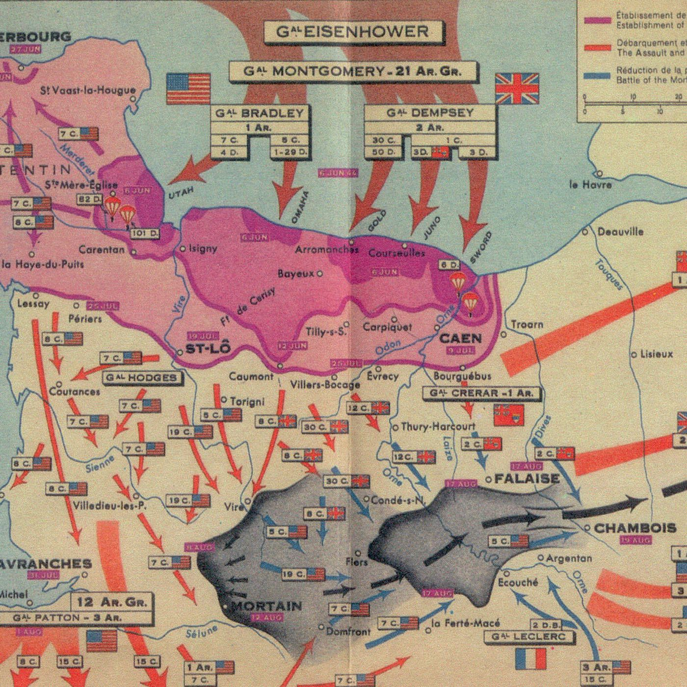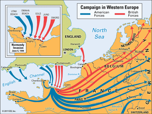 Παρακάτω τέσσερεις (4) χάρτες-για να αντιληφθούμε κατά την ανάγνωση την όλη πορεία των επιχειρήσεων – που δείχνουν από ποια λιμάνια της Αγγλίας ξεκίνησαν οι συμμαχικές δυνάμεις ,σε ποια σημεία αποβιβάσθηκαν στην Νορμανδία της Γαλλίας ,ποιες Μονάδες συμμετείχαν ,ποιοι ήταν Διοικητές των Μεγάλων Σχηματισμών ,ποια προγεφυρώματα δημιούργησαν (ροζέ χρώμα στον τρίτο χάρτη) και προς τα που κατευθύνθηκαν μέχρι την Γερμανία.