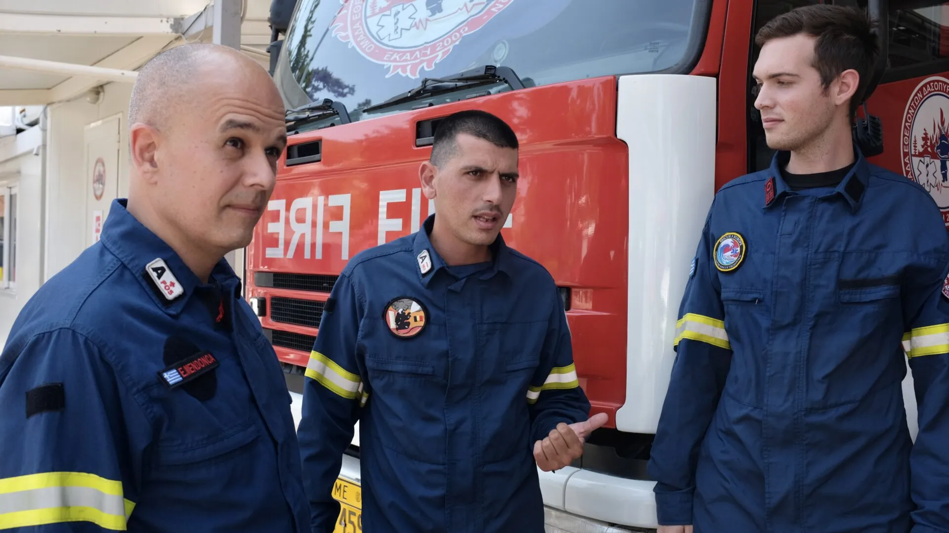 Ο Emmanuel Mendonça (αριστερά) και ο Giorgios Dertillis (μέση) συσκέπτονται με άλλους εθελοντές πυροσβέστες της πρωινής βάρδιας. Φωτογραφία: Jessica McKenzie