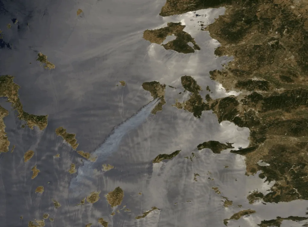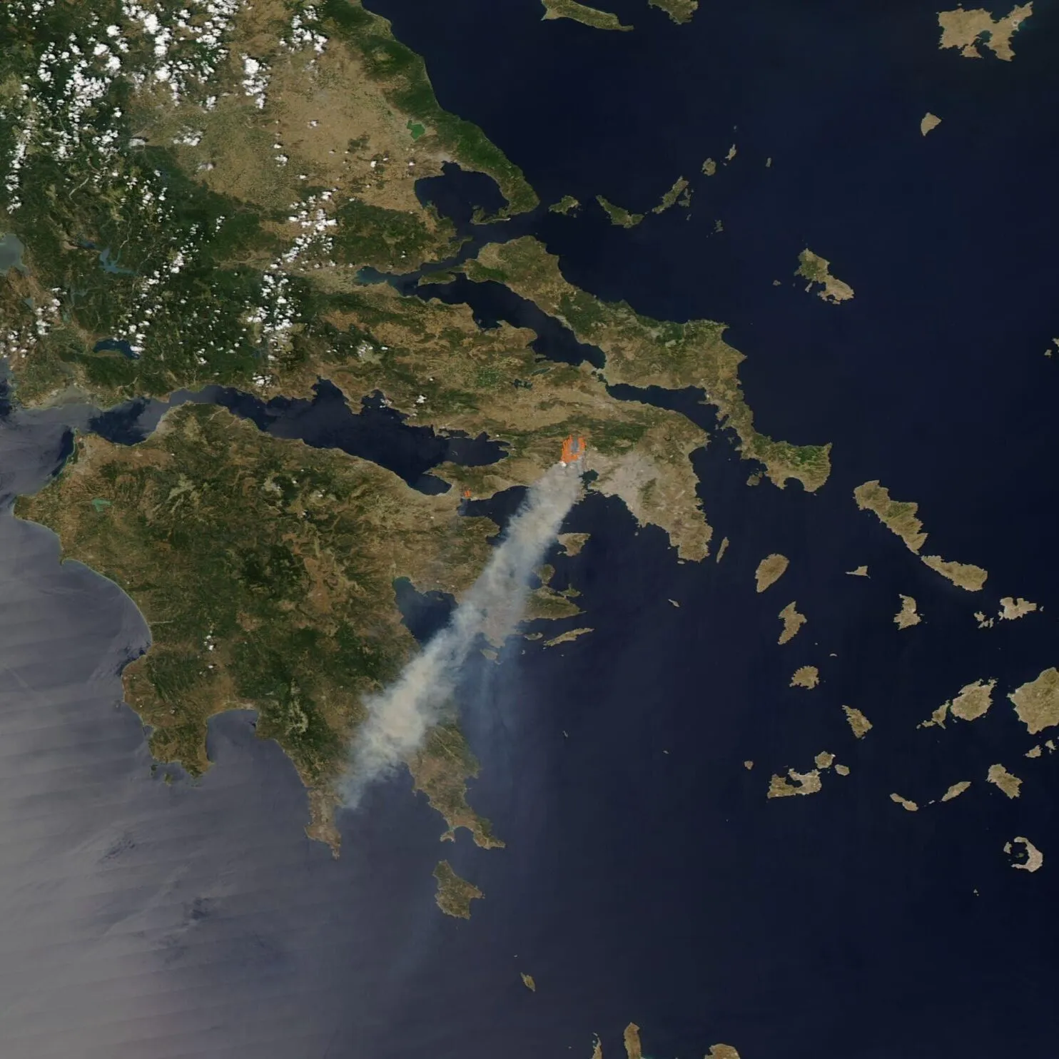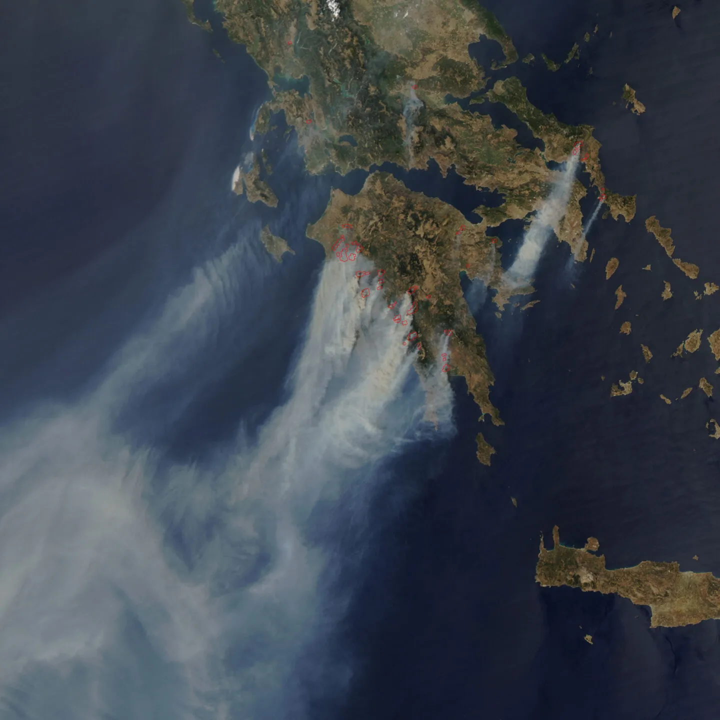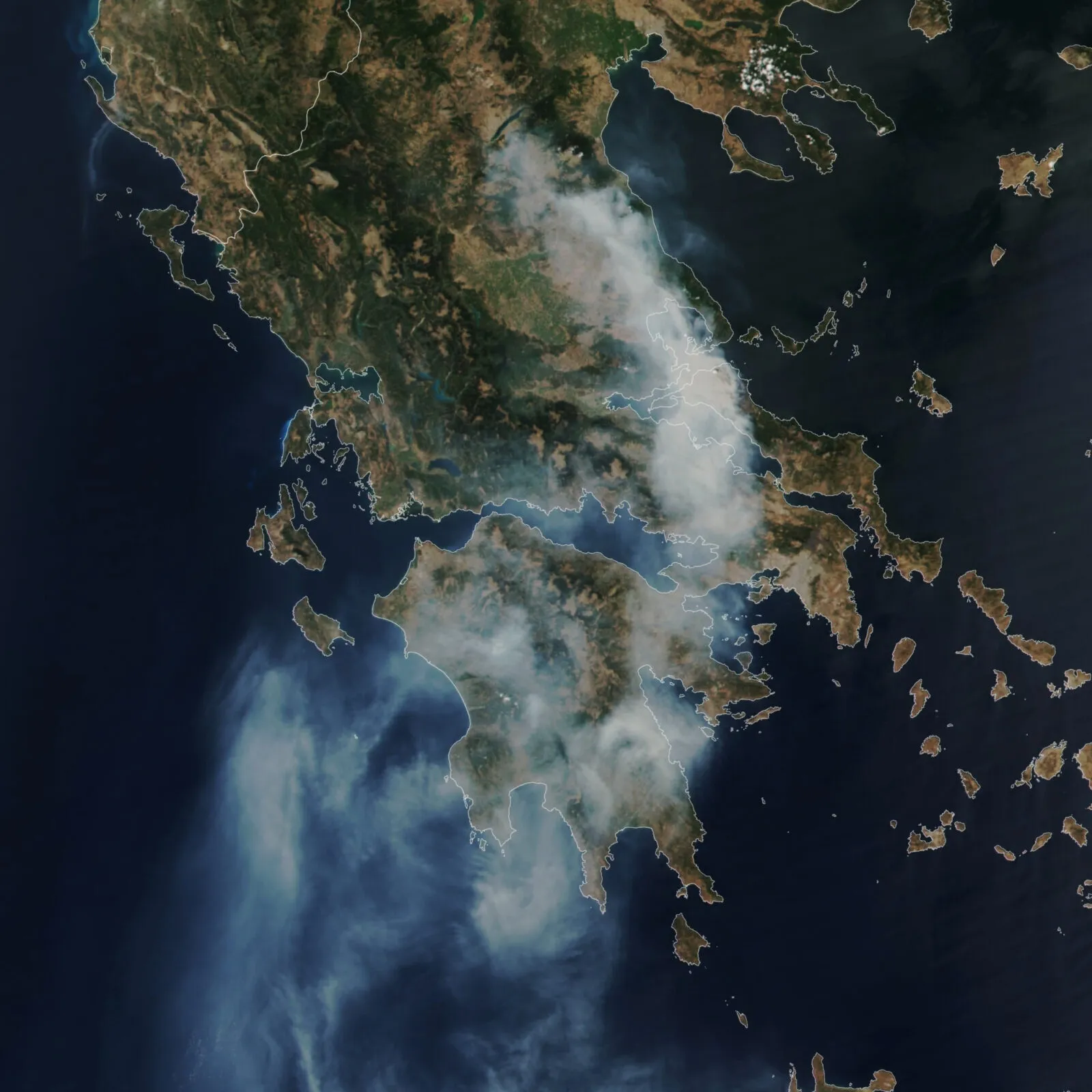 Ο καπνός από τις πυρκαγιές εξαπλώνεται σε όλη τη νότια Ελλάδα τον Αύγουστο του 2021. Παρατηρητήριο Γης της NASA