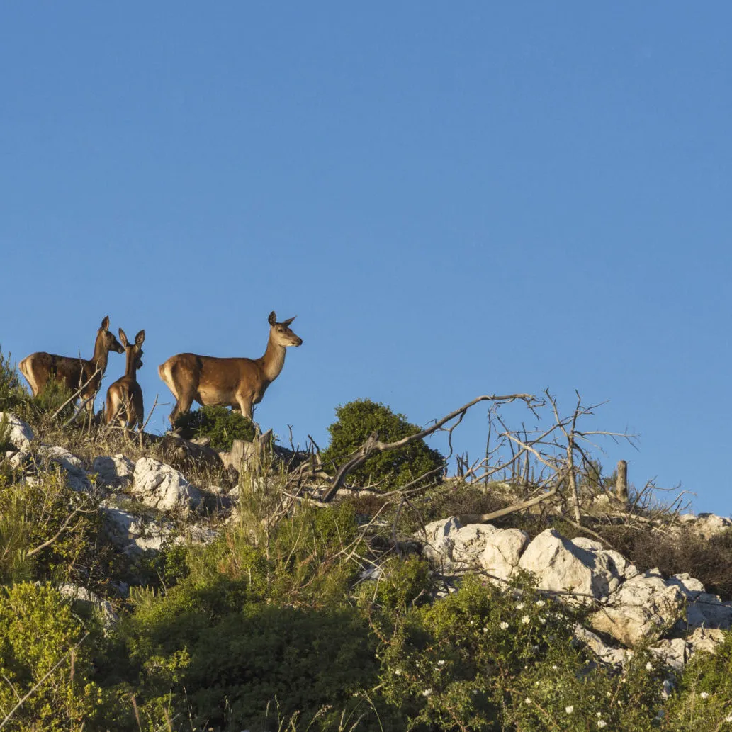 Μια οικογένεια κόκκινων ελαφιών στην Πάρνηθα, ένα ιερό ζώο της Ελληνίδας θεάς Άρτεμης. Θεωρούνται είδος υπό εξαφάνιση στην Ελλάδα. Φωτογραφία: Ian Gkoutas, CC BY-SA 4.0 μέσω Wikimedia Commons.