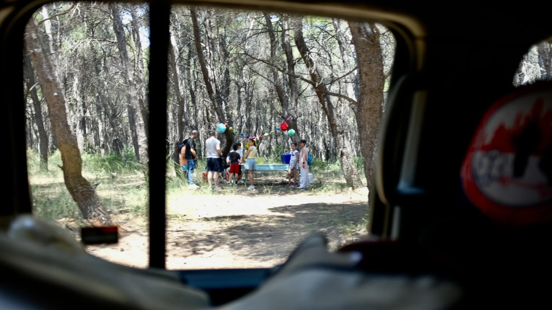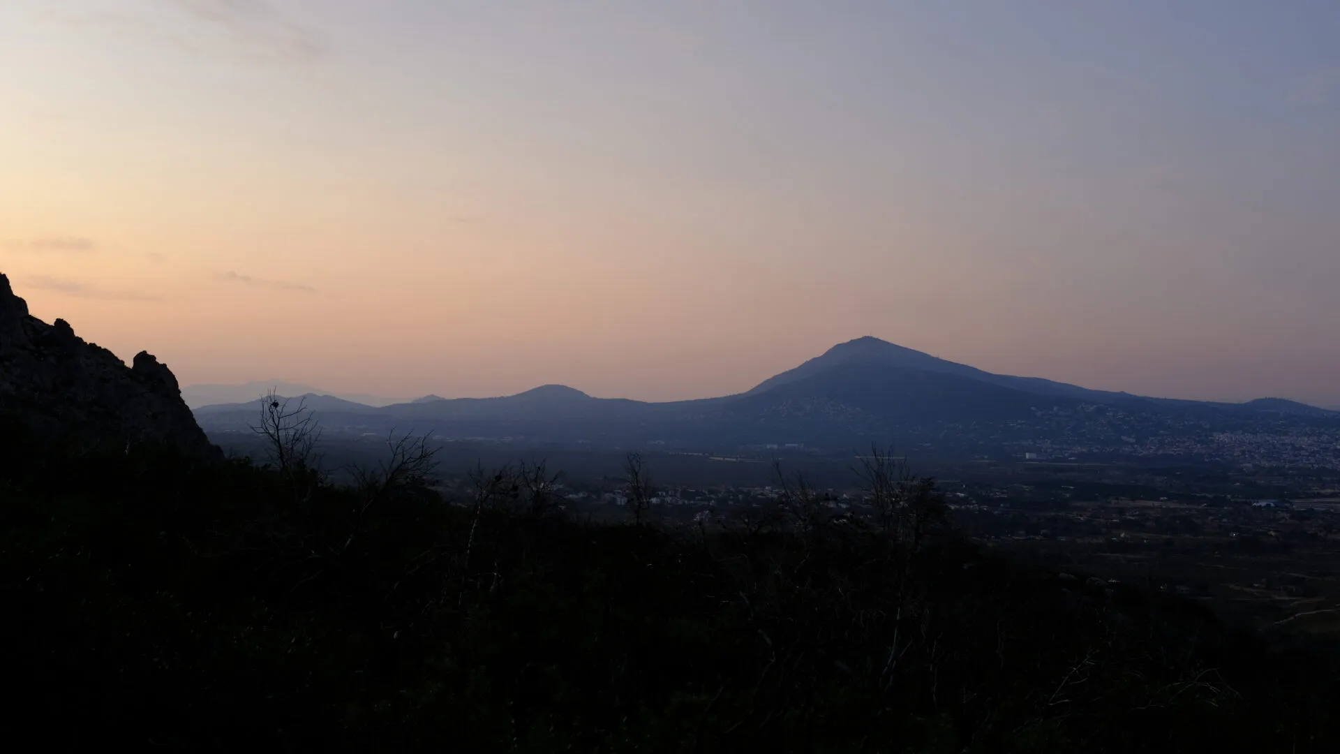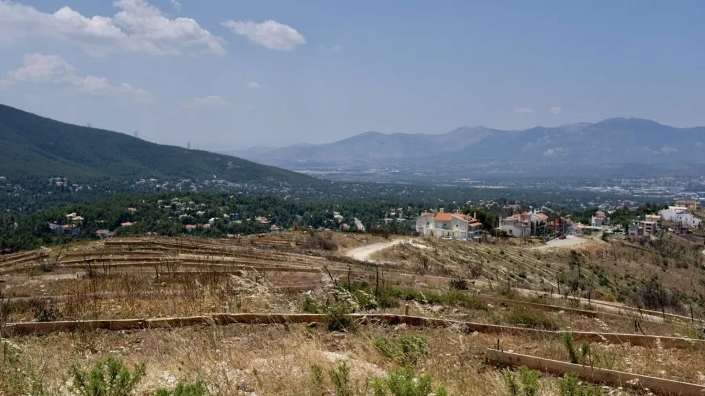 Φτάσαμε σε ένα σημείο με θέα, από όπου μπορούσαμε να κοιτάξουμε προς τα βουνά στην απέναντι πλευρά της κοιλάδας, εκεί όπου μεγάλες πυρκαγιές το 2007, το 2021 και το 2023 έκαψαν μεγάλες εκτάσεις του Εθνικού Δρυμού Πάρνηθας. Μού έδειξαν την λωρίδα σκούρου πράσινου που διασχίζει την καρδιά του πάρκου, κατηφορίζοντας από την κορυφή της Πάρνηθας—αυτό που απομένει από το δάσος μετά από τις σχεδόν διαδοχικές πυρκαγιές. Ό,τι βρίσκεται δεξιά, είπαν, κάηκε το 2021, και ό,τι στα αριστερά, το 2023.