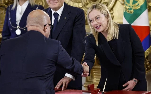 Η μεταφασίστρια Τζόρτζια Μελόνι παρέλαβε σήμερα και επισήμως τα ηνία της χώρας από τον Μάριο Ντράγκι Οποιος περίμενε αντιδράσεις από το εξωτερικό, διαψεύστηκε. Αν και η Ρώμη βρισκόταν για ένα μήνα στο επίκεντρο των ευρωπαϊκών φόβων για τι θα σημάνει η άνοδος της ακροδεξιάς στην εξουσία, αρκούσε η διακήρυξη πίστης από την 45 χρονη Μελόνι στο ΝΑΤΟ και στην ΕΕ, για να εξανεμιστούν οι ανησυχίες. Ο ένας μετά τον άλλο, όλοι οι ξένοι ηγέτες έσπευσαν να τη συγχαρούν. Άλλωστε και χωρίς ουδεμία αμφισβήτηση, την Μελόνι την εξέλεξε ο κυρίαρχος Ιταλικός λαός. Η πρωθυπουργός και οι 24 υπουργοί της – ακριβώς το ένα τέταρτο εκ των οποίων είναι γυναίκες – ορκίστηκαν να «μείνουν πιστοί στη δημοκρατία, να τηρούν πιστά το σύνταγμα και τους νόμους και να ηγηθούν του έθνους με αποκλειστικό γνώμονα το συμφέρον του λαού».Το να κρίνουμε άλλωστε μια κυβέρνηση ,πριν πάρει την πρώτη συγκεκριμένη απόφαση, θα ήταν επιζήμιο.