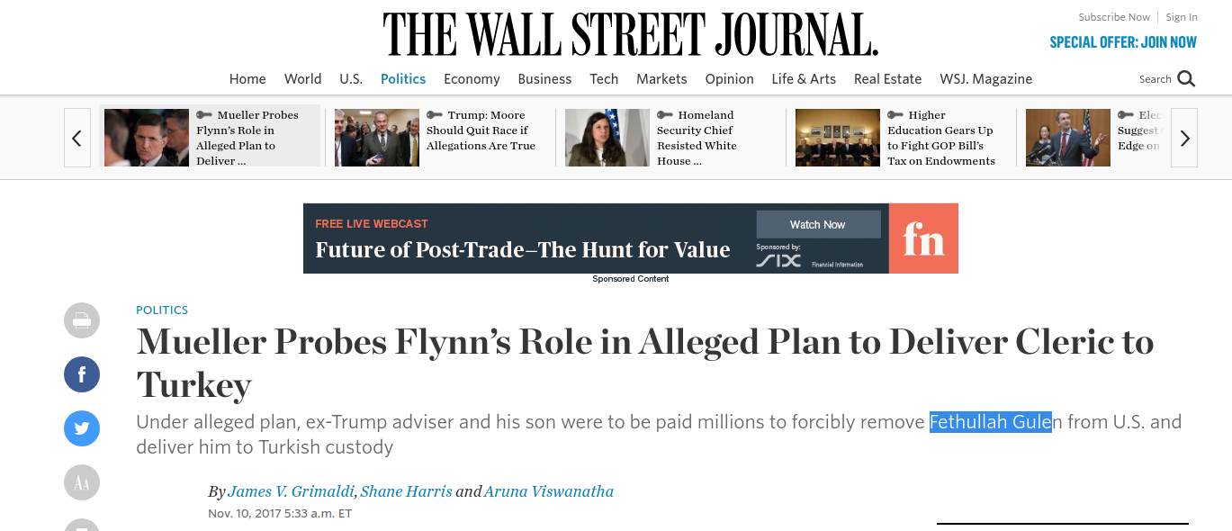 Σύμφωνα με την Wall Street Journal, ο ειδικός εισαγγελέας Ρόμπερτ Μιούλερ διερευνά το ενδεχόμενο ο Φλιν να είχε συμφωνήσει να λάβει κάποιο χρηματικό ποσό για την μεταφορά του Γκιουλέν στην Τουρκία.
