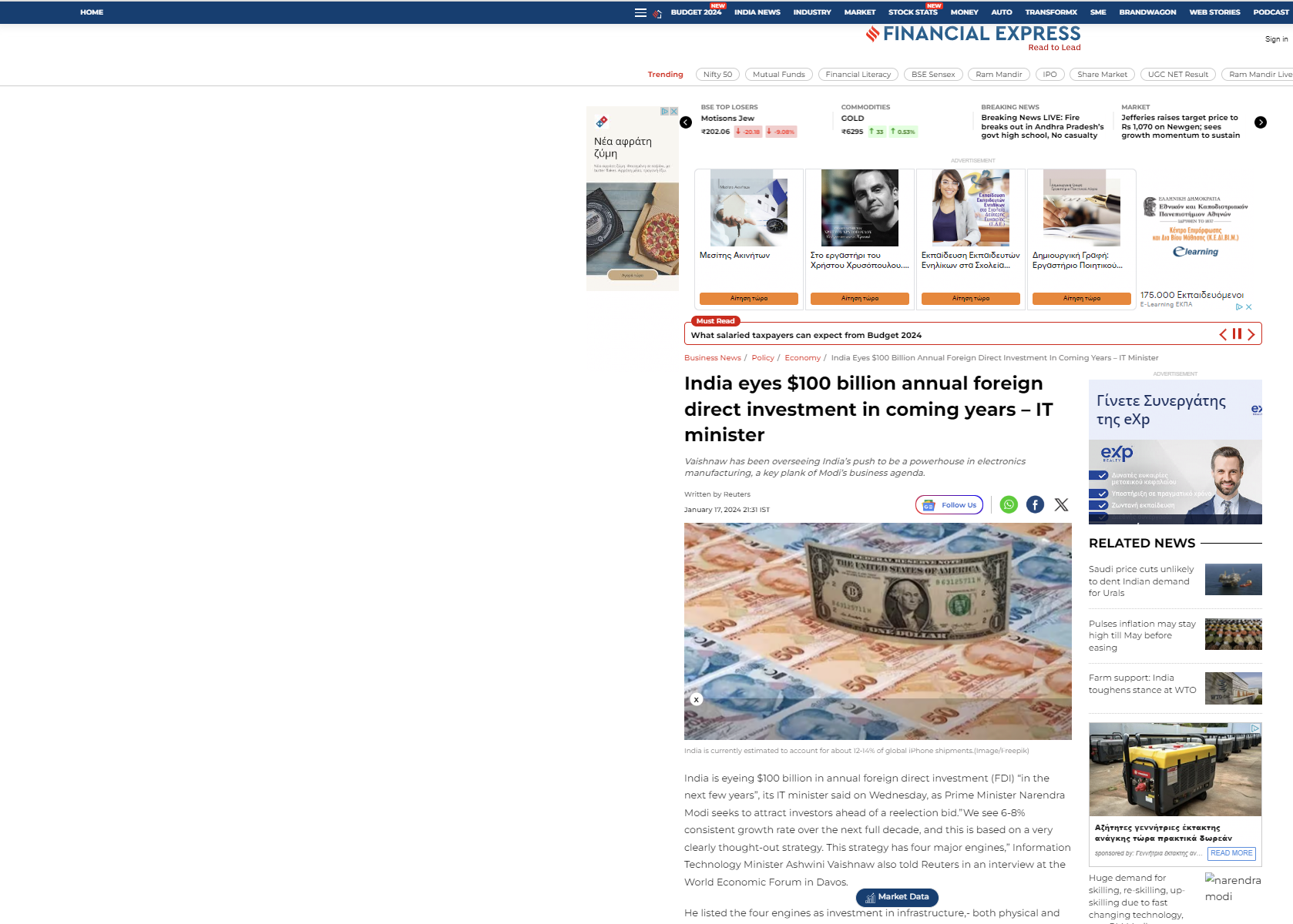 Η Ινδία προσβλέπει σε ετήσιες άμεσες ξένες επενδύσεις (FDI) 100 δισεκατομμυρίων δολαρίων «τα επόμενα χρόνια», δήλωσε ο υπουργός πληροφορικής της την Τετάρτη 17 Ιανουαρίου 2025, καθώς ο πρωθυπουργός Ναρέντρα Μόντι επιδιώκει να προσελκύσει επενδυτές πριν από μια προσφορά επανεκλογής.» Βλέπουμε 6-8% σταθερό ρυθμό ανάπτυξης την επόμενη ολόκληρη δεκαετία, και αυτό βασίζεται σε μια πολύ ξεκάθαρα μελετημένη στρατηγική. Αυτή η στρατηγική έχει τέσσερις βασικούς κινητήρες», δήλωσε στο Reuters ο υπουργός Πληροφορικής Ασουίνι Βαϊσνάβ σε συνέντευξή του στο Παγκόσμιο Οικονομικό Φόρουμ στο Νταβός.