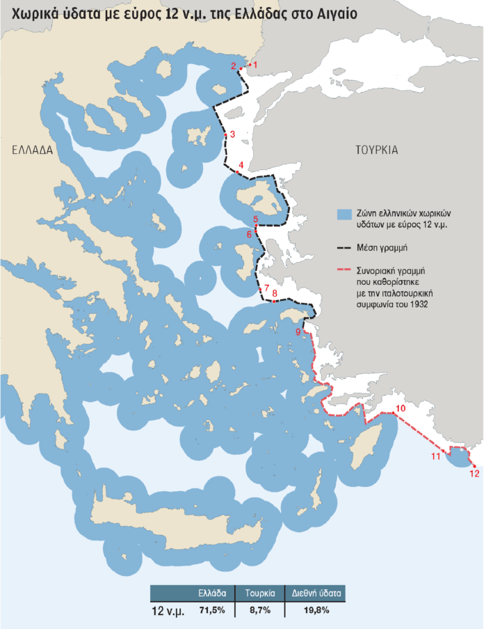 Από το 1995, η Τουρκία, με απόφαση της Εθνοσυνέλευσής της, απειλεί την Ελλάδα ότι αν επεκτείνει τα χωρικά ύδατά της πέραν των 6 ν.μ. στο Αιγαίο, όπως έχει το μονομερές δικαίωμα από το Διεθνές Δίκαιο της Θάλασσας, αυτό θα αποτελέσει αιτία πολέμου (casus belli). Οι εξαρτημένες, φοβικές και ηττοπαθείς κυβερνήσεις στην Αθήνα υποκύπτουν επί 27 χρόνια στον τουρκικό εκβιασμό. Τα 6 ν.μ. έχουν καταστεί, εκ των πραγμάτων, status quo στο ελληνοτουρκικό σύστημα. Η Ελλάδα επιβάλλεται να ανατρέψει το status quo και να επεκτείνει μονομερώς τα χωρικά ύδατά της στα 12 ν.μ. σ’ όλες τις ακτές της (ηπειρωτικές και νησιωτικές) στο Αιγαίο Πέλαγος καθώς και στις νότιες νησιωτικές ακτές της στην Ανατολική Μεσόγειο, από την Κρήτη μέχρι το Καστελόριζο. Πριν από την επέκταση των χωρικών υδάτων πρέπει να γίνει το κλείσιμο των κόλπων και η χάραξη ευθειών γραμμών βάσης από τις οποίες θα υπολογιστεί το εύρος των 12 ν.μ.