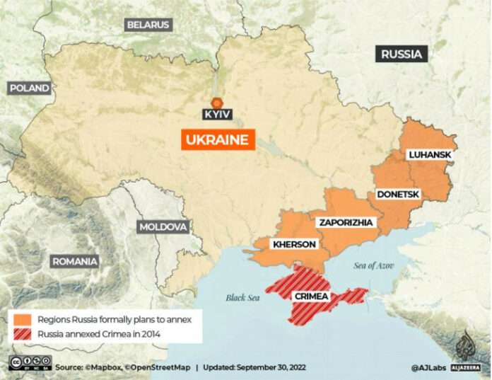 Δεύτερον. Η Ρωσία κατέλαβε εδάφη, στα ανατολικά και νότια, που κατοικούνται πλειοψηφικά από ρωσικό πληθυσμό. Σήμερα κατέχει το 100% του Λουγκάνσκ, το 60% του Ντονέτσκ, το 72% της Ζαπορίζια και το 88% της Χερσώνας. Όμως, μεγάλο μέρος του ρωσικού πληθυσμού εξακολουθεί να διαβιεί σε εδάφη που βρίσκονται υπό τον έλεγχο του Κιέβου. Πρόκειται για εδάφη δυτικά της γραμμής αντιπαράθεσης, στην κεντρική Ουκρανία και εδάφη στο Νότο από το Νικολάγιεφ και την Οδησσό μέχρι τα σύνορα με τη Μολδαβία. Τι θα γίνει με αυτούς τους Ρώσους; Θα τους εγκαταλείψει η Μόσχα στην τύχη τους;