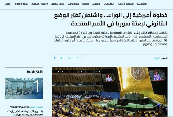 -US: Οι Ηνωμένες Πολιτείες ανακοινώνουν ότι δεν αναγνωρίζουν τη λεγόμενη «Νέα Συριακή Κυβέρνηση» υπό την ηγεσία του τρομοκρατικού καθεστώτος HTS. Η Ουάσιγκτον ενημερώνει τη συριακή αποστολή στη Νέα Υόρκη για την αλλαγή του νομικού της καθεστώτος: δεν είναι πλέον αναγνωρισμένο κράτος, αλλά κυβέρνηση που δεν αναγνωρίζεται από τις ΗΠΑ.