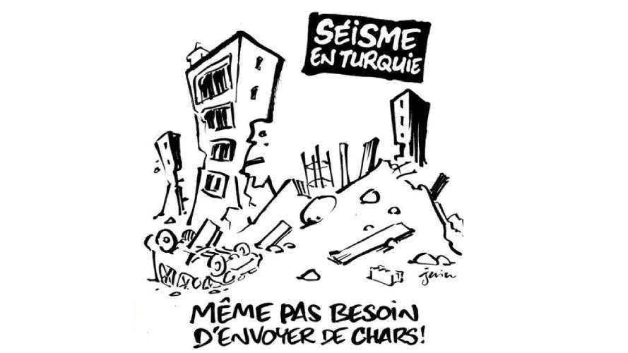 Υ.Γ. Το σκίτσο είναι από το γαλλικό σατιρικό περιοδικό Charlie Hebdo: “Σεισμός στην Τουρκία-ή ίδια δε χρειάζεται να στείλει άρματα”. Το σκίτσο προκάλεσε έντονες αντιδράσεις από τουρκικής πλευράς.