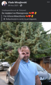 Ο αντιπρόεδρος του VMRO-DPMNE, κ. Βλάντο Μισαϊλόφσκι, τη στιγμή που κάνει τον χαιρετισμό της «Ενωμένης Μακεδονίας» (είναι αυτή που περιλαμβάνει και τη Χαλκιδική) ενώ σχολιάζει με τη φράση «Για μια τέλεια Μακεδονία»17.