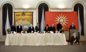 Ο πρόεδρος της Ακαδημίας Επιστημών και Τεχνών των Σκοπίων, κ. Λιούπτσο Κότζαρεφ (πέμπτος από αριστερά), στις 4-2-2023, σε εκδήλωση Σκοπιανών στον Καναδά για την 150η επέτειο της γέννησης του Βούλγαρου Γκότσε Ντέλτσεφ. Πίσω του σε τεράστιες διαστάσεις βρίσκονται ο Ήλιος της Βεργίνας και ο χάρτης της λεγόμενης «Ενωμένης Μακεδονίας» (είναι αυτή που περιλαμβάνει και τη Χαλκιδική) στον οποίο αναγράφεται η λέξη «Μακεδονία»18.