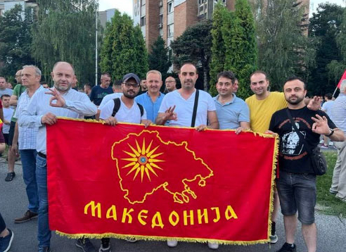 Ο δήμαρχος της πόλης Ντεμίρ Χισάρ κ. Νίκολα Ναϊντόφσκι (πρώτος από αριστερά) με μέλη του δημοτικού συμβουλίου του στις 10-7-2022 κατά τη διάρκεια πορείας διαμαρτυρίας στα Σκόπια κάνουν το χαιρετισμό της «Ενωμένης Μακεδονίας» ενώ κρατούν πανό που φέρει τον Ήλιο της Βεργίνας, τη λέξη «Μακεδονία» και χάρτη που περιλαμβάνει τη Θάσο και τη Χαλκιδική19.
