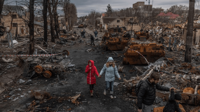 Συντρίμια σε δρόμο της Μπούτσα, κοντά στο Κίεβο.