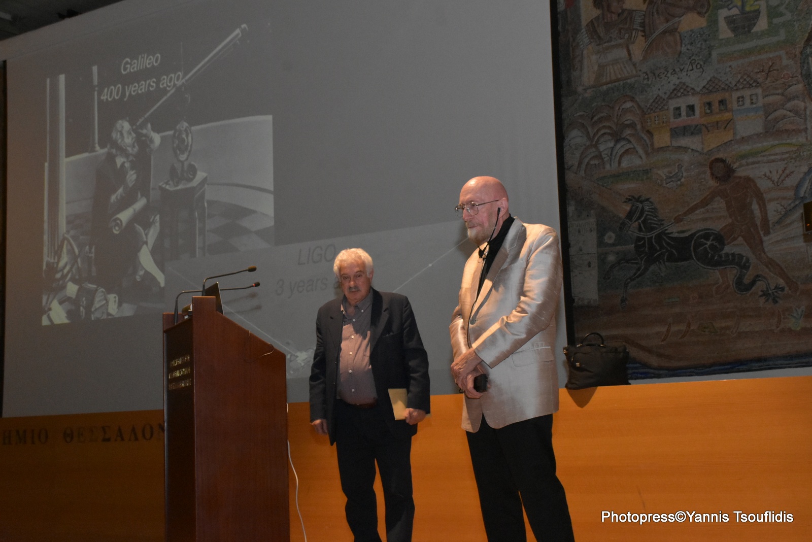 Ο εκδότης του βιβλίου του Παναγιώτης Χαρίτος, φυσικός και αυτός με μεταπτυχιακές σπουδές στο Λονδίνο, εργάζεται επί πολλά χρόνια στο CERN, τον κάλεσε στην Θεσσαλονίκη και μίλησε σε εκδήλωση που οργανώθηκε στην κατάμεστη αίθουσα εκδηλώσεων του ΑΠΘ. Την ομιλία οργάνωσε εκτός από τον εκδοτικό οίκο, το Εργαστήριο Αστρονομίας του ΑΠΘ και ο Σύλλογος Αποφοίτων ΑΠΘ του οποίου,, τότε, προήδρευε η ταπεινότης μου.