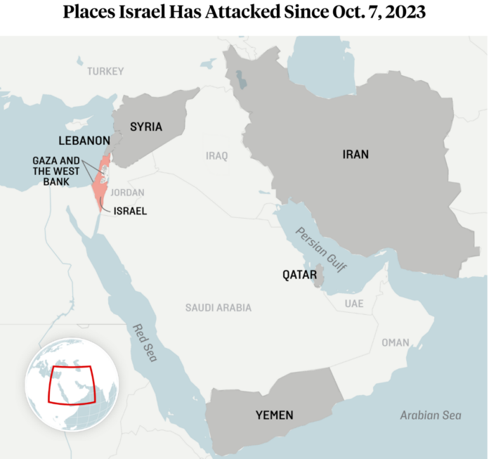 Από την επίθεση που ηγήθηκε η Χαμάς στις 7 Οκτωβρίου 2023, το Ισραήλ έχει πραγματοποιήσει στρατιωτικές και μυστικές επιχειρήσεις σε πολλές χώρες της Μέσης Ανατολής, πέρα από τη Γάζα, συμπεριλαμβανομένων του Ιράν, του Λιβάνου, της Υεμένης, της Συρίας και του Κατάρ. Ο ισραηλινός στρατός είναι επίσης εξαιρετικά ενεργός στην κατεχόμενη Δυτική Όχθη από τις 7 Οκτωβρίου, διεξάγοντας χερσαίες και αεροπορικές επιχειρήσεις εν μέσω μιας απότομης αύξησης της βίας από εποίκους κατά των Παλαιστινίων. Οι ισραηλινές επιθέσεις σε ολόκληρη την περιοχή κυμαίνονται από δολοφονίες —συμπεριλαμβανομένης μιας εντυπωσιακής επιχείρησης με εκρηκτικούς βομβητές στον Λίβανο— έως ευρύτερες στρατιωτικές εκστρατείες που αποσκοπούν στην αποδυνάμωση των δυνατοτήτων των αντιπάλων της χώρας.