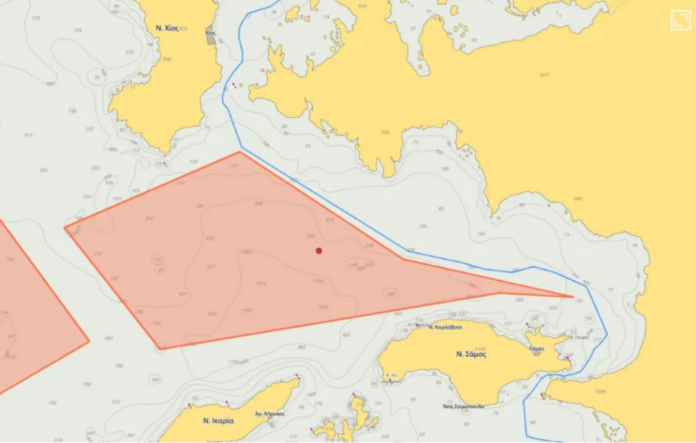 Φωτογραφία: οι ελληνικές Ένοπλες Δυνάμεις πραγματοποίησαν την Δευτέρα αεροναυτική άσκηση δεσμεύοντας με NAVTEX και NOTAM περιοχές του Αιγαίου όπως διακρίνονται στον χάρτη. Η άσκηση αμφισβήτησε στο πεδίο την NAVTEX που εξέδωσε η Τουρκία.