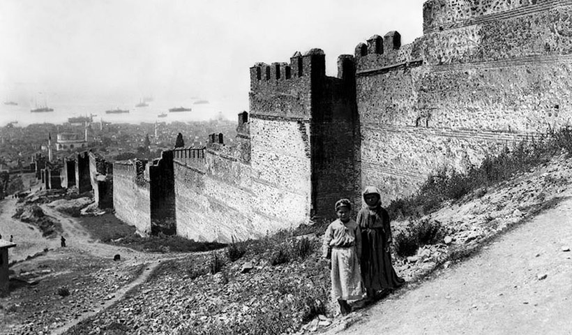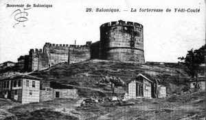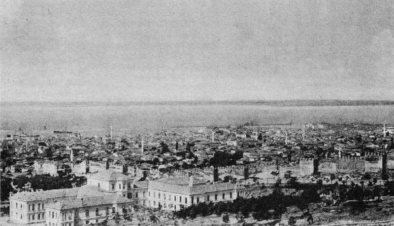 Φωτογραφία του 1916 όπου φαίνονται τα ανατολικά τείχη της πόλης, το νοσοκομείο, και κάτω δεξιά οι Κήποι του Πασά