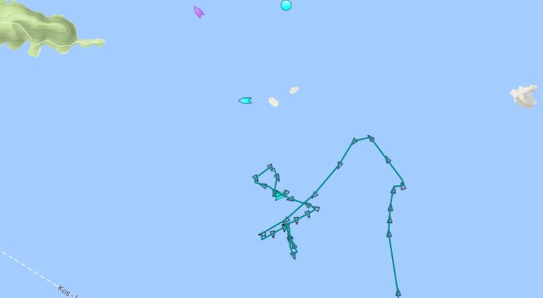 Στην δεύτερη εικόνα εμφανίζεται το ίχνος του πλου του σκάφους του Λιμενικού με στοιχεία TCSG UMUT το τελευταίο εικοσιτετράωρο.