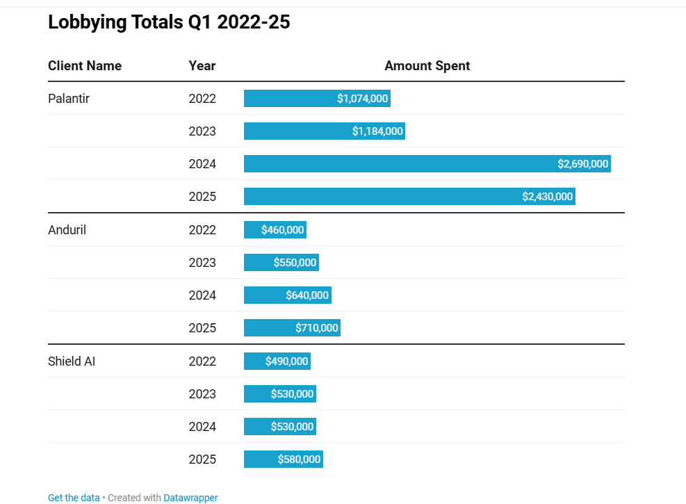 Με τη βοήθεια των πιο ισχυρών λομπιστικών εταιρειών της K Street — όπως οι Invariant, Cornerstone Government Affairs, Akin Gump και Brownstein Hyatt — η άνοδος της Palantir είναι πραγματικά ραγδαία. Έρευνα του Tech Transparency Project αποκάλυψε ότι η Palantir έχει προσλάβει πλήθος προσώπων με ισχυρούς δεσμούς με το Κογκρέσο και τις ομοσπονδιακές υπηρεσίες, έχει αυξήσει σημαντικά τις λομπιστικές της ενέργειες και έχει ιδρύσει ένα ίδρυμα για τη χρηματοδότηση ερευνών, συνεδρίων και δημόσιου λόγου που επηρεάζουν την πολιτική ατζέντα — όλα αυτά, σχεδόν αθόρυβα.