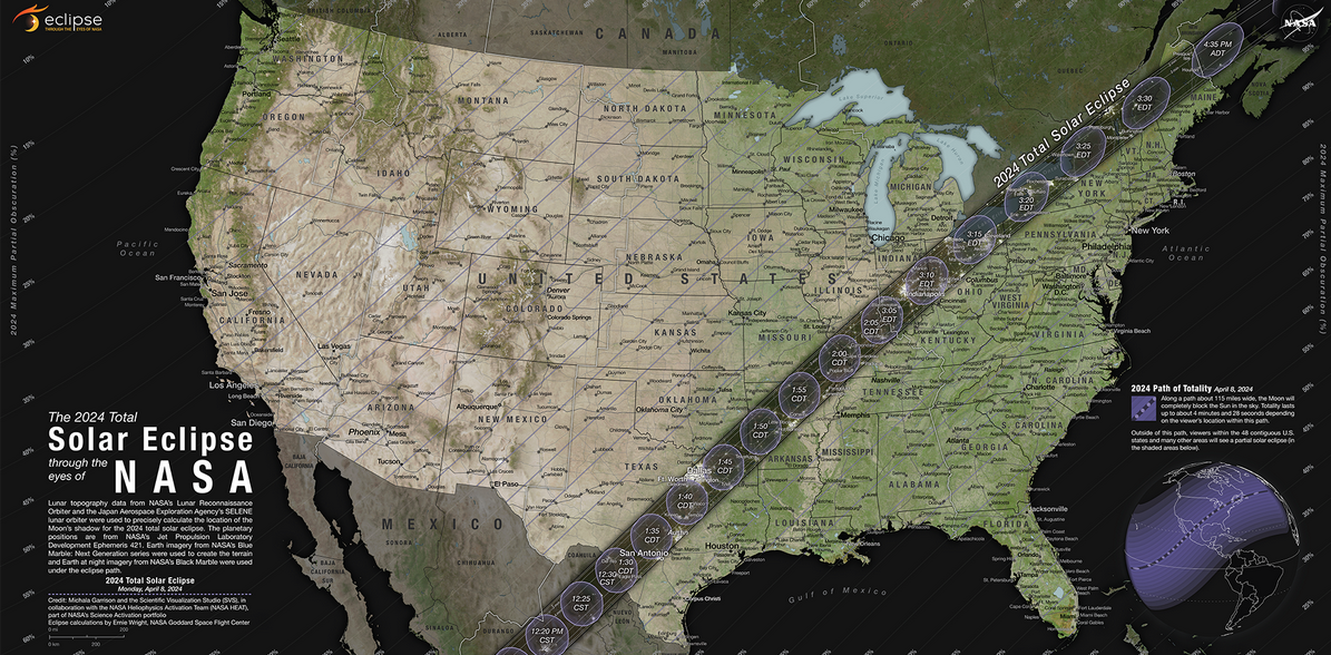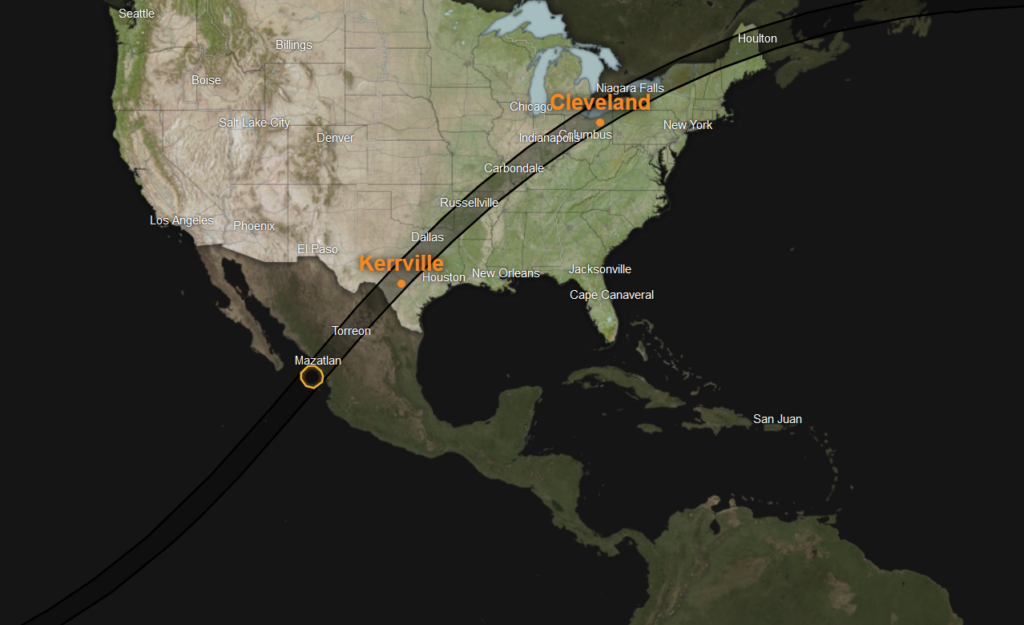 Εικόνα (5): Το μονοπάτι της έκλειψης Ηλίου του 2024 και οι περιοχές που θα την παρατηρήσουν.