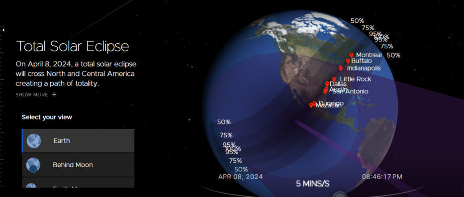 Την Δευτέρα 8 Απριλίου 2024 θα πραγματοποιηθεί ολική έκλειψη ηλίου η οποία θα μπορεί να παρατηρηθεί από περιοχές του Μεξικού, της Βόρειας Αμερικής και του Καναδά.