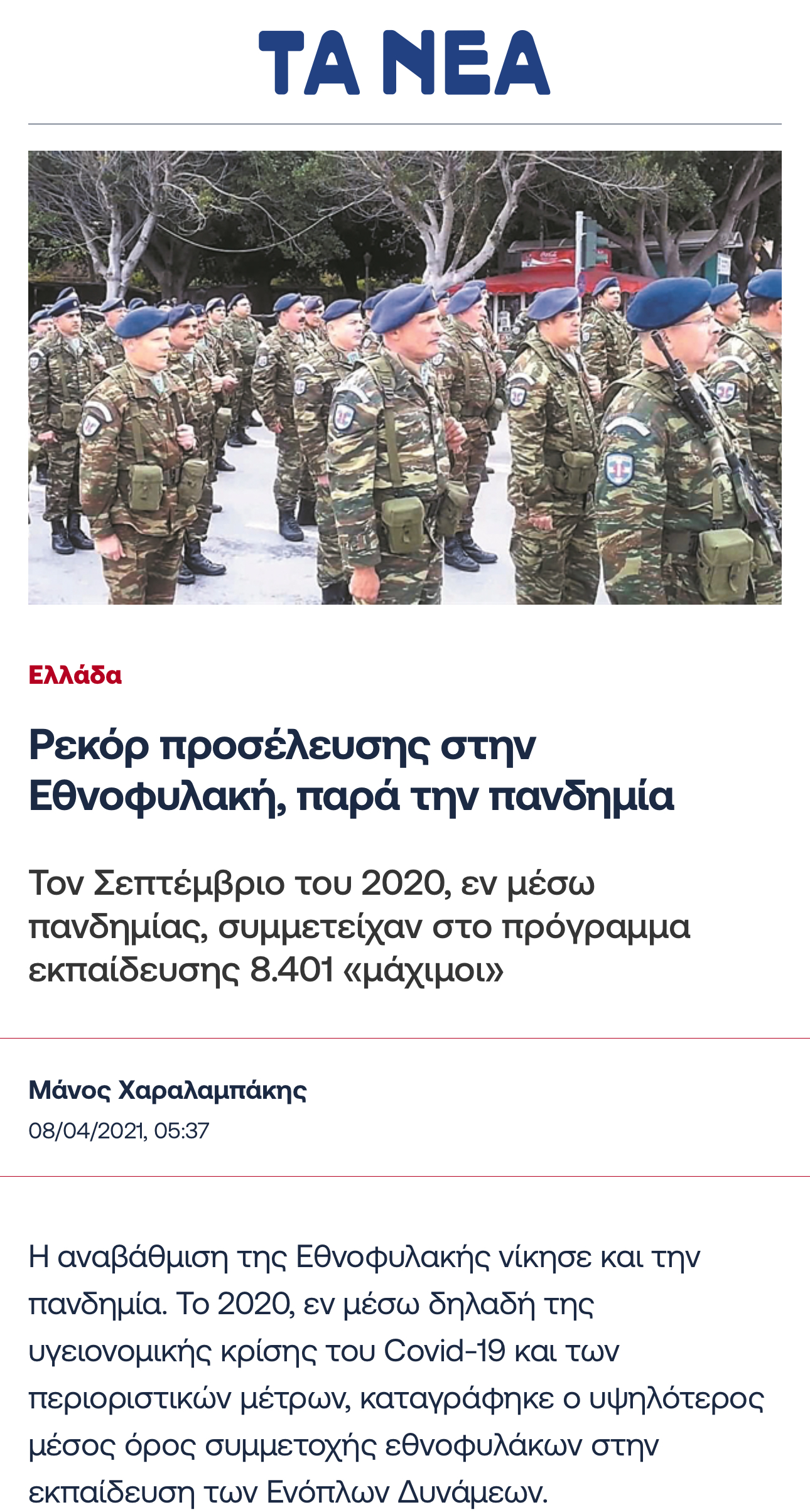 [3] Μάνος Χαραλαμπάκης, «Ρεκόρ προσέλευσης στην Εθνοφυλακή, παρά την πανδημία», https://www.tanea.gr/2021/04/08/greece/rekor-proseleysis-stin-ethnofylaki-para-tin-pandimia/, πρόσβαση 21 Νοε 25.