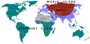 - Το ασταθές διεθνές περιβάλλον και σύγχρονες προκλήσεις κυριαρχίας: Σε αυτό το ασταθές παγκοσμιοποιημένο περιβάλλον παλαιοί και νέοι παίκτες αναδύονται, ενώ μεγάλες δυνάμεις πέφτουν σε παρακμή στην ‘παγκόσμια σκακιέρα’, όπως χαρακτηρίζει την Ευρασία ο Zbigniew Brzezinski[16], σύμφωνα με τον οποίο, όποιος κυριαρχεί σε αυτήν, ελέγχει και ολόκληρο τον κόσμο. Συμφώνησε δηλαδή με την ΄προφητεία΄ του Halford Mackinder[17] το 1904, όπως παρουσιάζεται στο Σχήμα 1. Αυτή τη στιγμή βρίσκονται σε εξέλιξη τεράστια επενδυτικά προγράμματα με ασιατικά κεφάλαια, ανά τον κόσμο, επιδιώκοντας να συνδέσουν πλουτοπαραγωγικές πηγές, κεφάλαια και ανθρώπους.