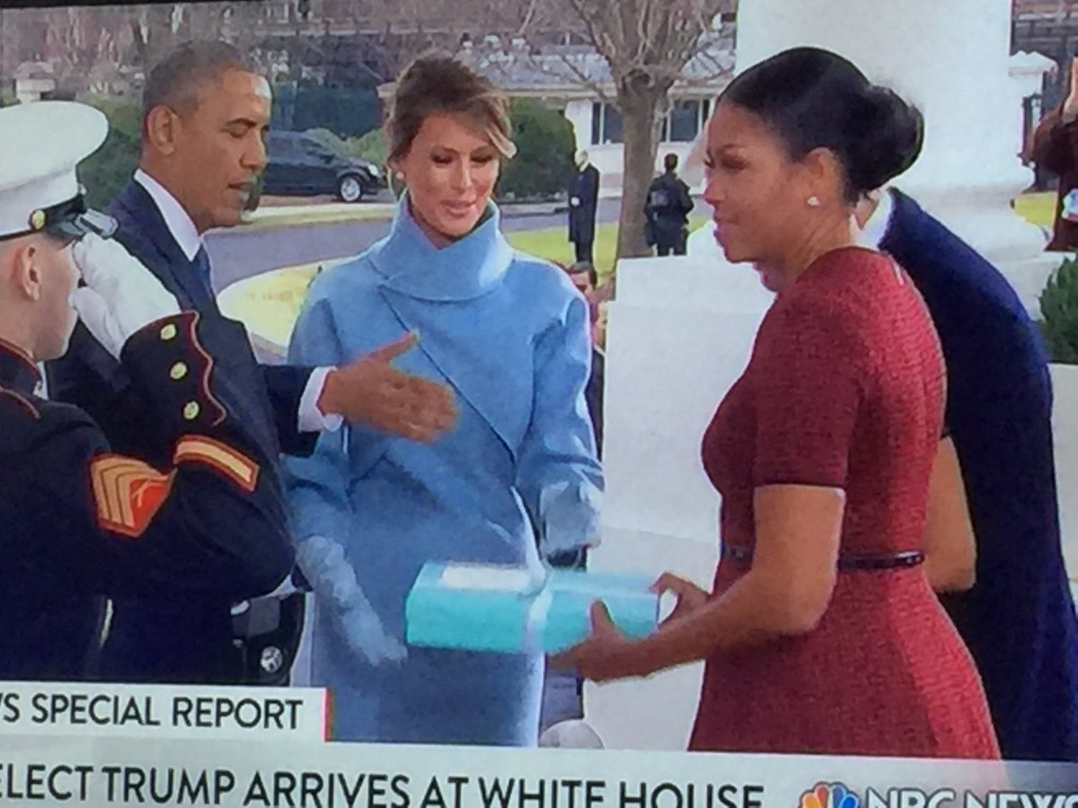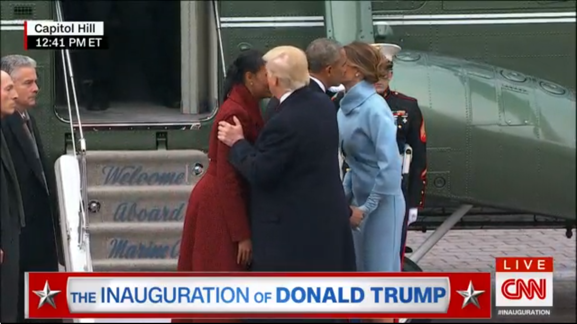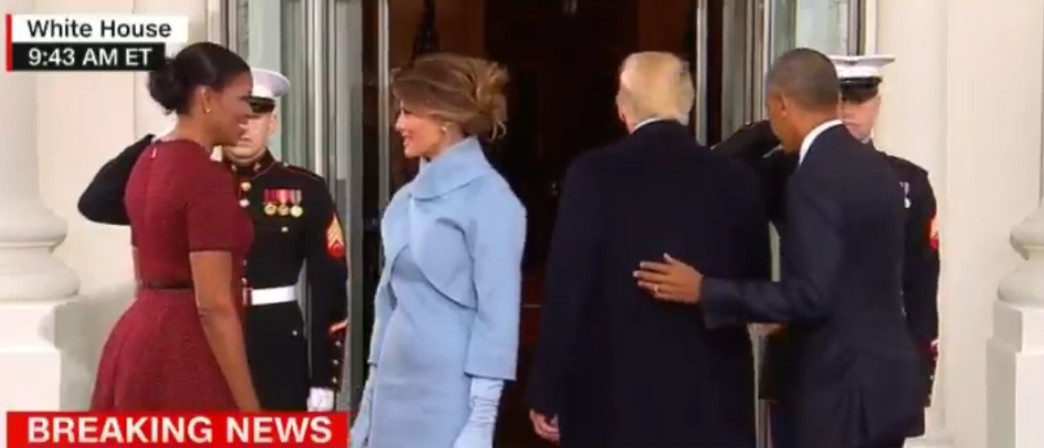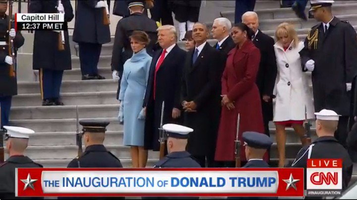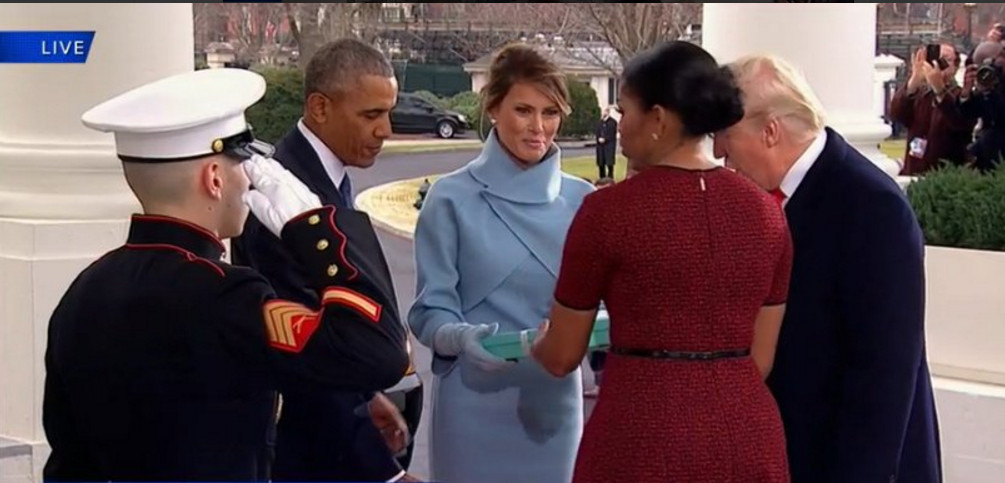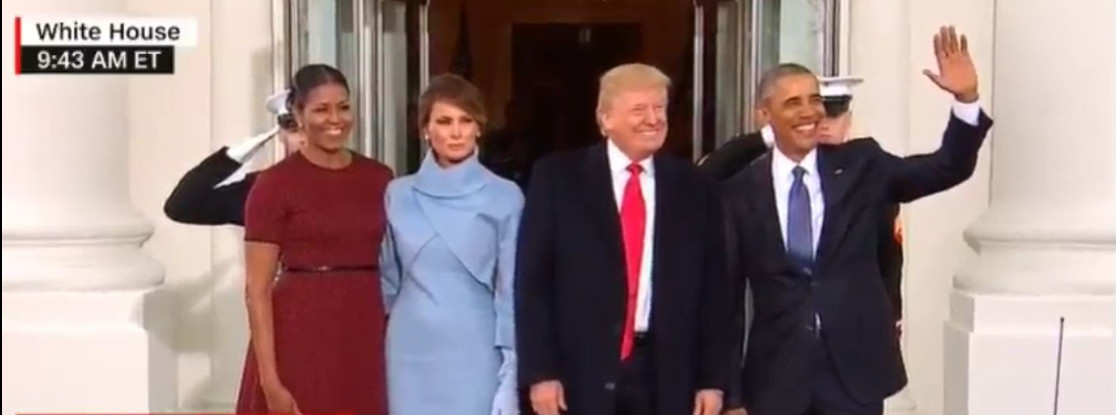 Λίγο πριν τις 5 το απόγευμα Ντόναλντ και Μελάνια Τραμπ πήγαν στον Λευκό Οίκο όπου τους υποδέχθηκαν ο Μπαράκ και η Μισέλ Ομπάμα για τσάι και ακολούθως, τα δύο ζευγάρια πήγαν μαζί στο Καπιτώλιο, το κτίριο στο οποίο στεγάζεται η Γερουσία.