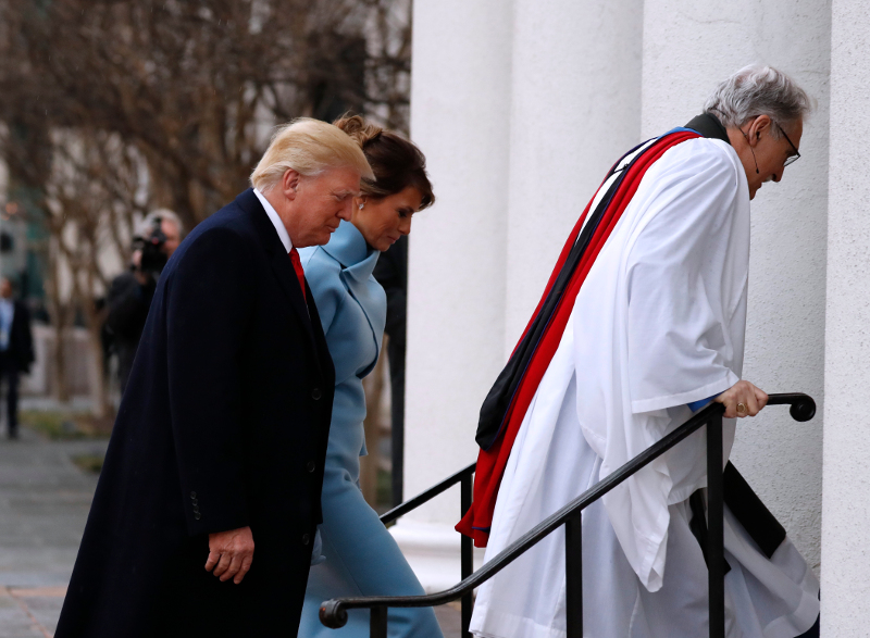 Στις 4 περίπου το απόγευμα, ώρα Ελλάδος (9 ώρα Ουάσινγκτον), Ντόναλντ Τραμπ και Μελάνια πήγαν, όπως προβλέπει το πρωτόκολλο, στην εκκλησία του Αγίου Ιωάννη, κοντά στο Λευκό Οίκο για την καθιερωμένη Δοξολογία. Η Πρώτη Κυρία των ΗΠΑ εντυπωσιακή, για μια ακόμη φορά, με γαλάζιο ταγιέρ Ralph Lauren, ασορτί γόβες και κότσο τα μαλλιά.