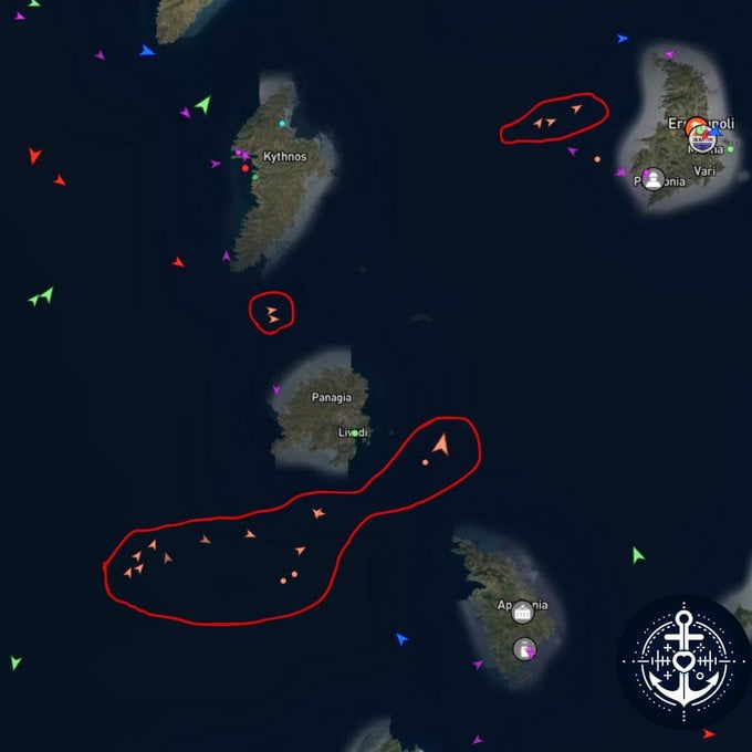 Τουλάχιστον 14 τουρκικές μηχανότρατες φαίνεται να αλιεύουν νότια της Σερίφου, 2 βόρεια αυτής και νότια της Κύθνου, ενώ άλλες 5 εντοπίζονται δυτικά της Σύρου. Τέλος, τουλάχιστον 7 σκάφη εντοπίζονται να αλιεύουν δυτικά μέχρι το νησί των Κυθήρων, νότια της Πελοποννήσου.Μερικά από τα σκάφη φαίνονται να πατούν σε ελληνικά χωρικά ύδατα, μια σαφής παραβίαση της αποκλειστικής κυριαρχίας εντός των 6 ναυτικών μιλίων της χωρικής θάλασσας των Κυκλάδων.Η λεηλασια συνεχιζεται με την λανθασμενη πολιτικη κατευνασμου του Μητσοτακη..