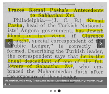 ❝ ΤΑ ΙΧΝΗ ΟΔΗΓΟΥΝ ΤΟΥΣ ΠΡΟΓΟΝΟΥΣ ΤΟΥ ΚΕΜΑΛ ΠΑΣΑ ΣΤΟ ΣΑΜΠΑΤΑΙ ΣΕΒΙ. (..) Εάν οι πληροφορίες του Κλάρενς Στρέιτ είναι σωστές, τότε ο #Κεμάλ Πασάς, ο ηγέτης της Τουρκικής Εθνικιστικής Κυβέρνησης της Άγκυρας, είχε εβραϊκό αίμα στις φλέβες του. (..)❞ The American Jewish World, 6 Οκτωβρίου 1922, σελ. 6..