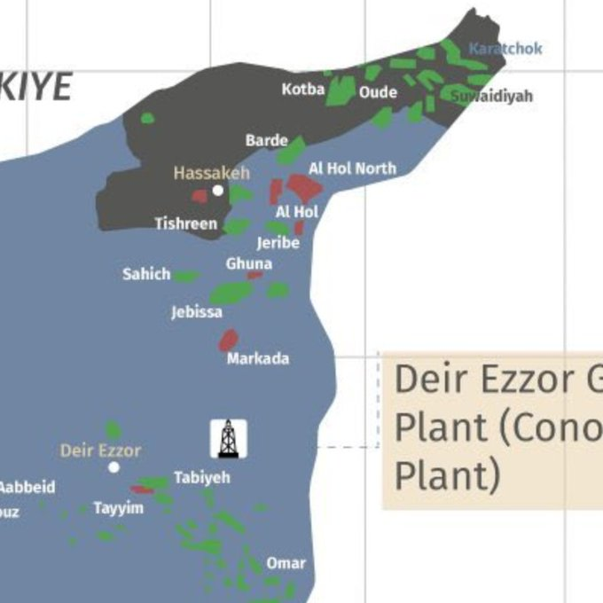 Χάρτης που δείχνει τα κοιτάσματα πετρελαίου και φυσικού αερίου στη Ροζάβα Πετρέλαια Πετρέλαια Φυσικού Αερίου Πολλοί άνθρωποι πιστεύουν ότι η πλειονότητα των εσόδων της Ροζάβα προέρχεται από το Ντέιρ εζ-Ζορ, αλλά αυτό είναι λανθασμένο. Το μεγαλύτερο μέρος προέρχεται από το Κυβερνείο Χασάκε, και συγκεκριμένα από την κουρδική περιοχή Ριμελάν.