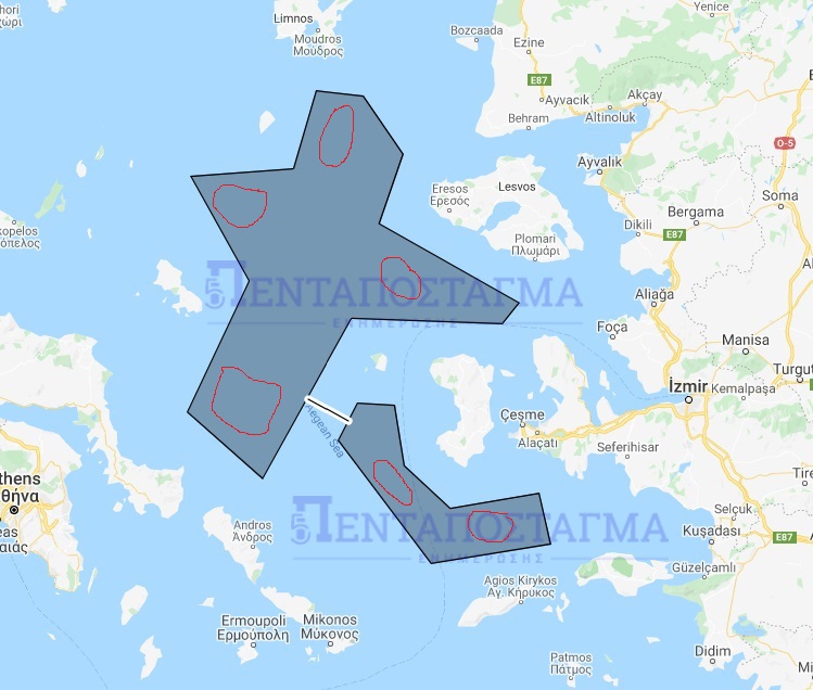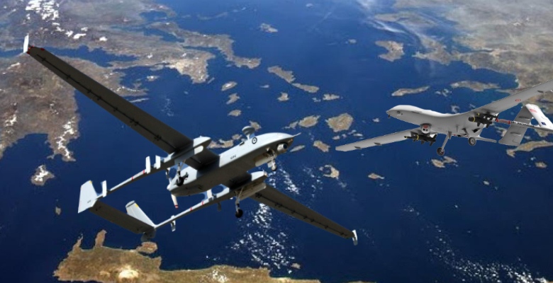 Ο χάρτης δείχνει τις περιοχές του Αιγαίου (όχι όλες) που θεωρούνται διεθνής εναέριος χώρος, και όπου τους τελευταίους μήνες τα τουρκικά μη επανδρωμένα αεροσκάφη (διαφόρων τύπων, αλλά βασικά αυτά με πτητική ικανότητα από 24 έως και 50 ώρες σουλατσάρουν συνεχώς έχοντας λάβει άδεια επί τούτου από την ημεδαπή Υπηρεσία Πολιτικής Αεροπορίας, προφανώς κατόπιν συνεννοήσεως με την Πολεμική Αεροπορία. Διότι εάν τέτοια συνεννόησης δεν υπήρξε, τότε πραγματικά ανοίγουν σκοτεινές ατραποί… Οι περιοχές αυτές συνδέονται με αεροδιαδρόμους (γραμμή) τους οποίους τα εν λόγω μη επανδρωμένα χρησιμοποιούν για να μεταβαίνουν από την μια στην άλλη, αξιοποιώντας την δυνατότητά τους να πετούν για 24 και πλέον ώρες. Αυτό σημαίνει ότι πρακτικά τα αεροχήματα αυτά δεν είναι δυνατόν να επιτηρηθούν οπτικά, καθώς θα έπρεπε συνεχώς κάποιος να είναι δίπλα. Το χειρότερο όμως είναι ότι τα αεροχήματα αυτά μπορούν κατά το δοκούν στο πλαίσιο αδειοδοτημένων πτήσεων να «παίζουν» αλλάζοντας το ένα το άλλο, καθώς όχι μόνο ακολουθούν πορείες διαρκών ελιγμών σε αζιμούθιο αλλά και καθ’ ύψος οπότε είναι πρακτικώς αδύνατον- ιδίως την νύχτα- να διαπιστωθεί από τα ραντάρ ή αεροσκάφος εάν το ίδιο ιπτάμενο μέσο ανεβαίνει ξανά σε ύψος ή εάν σε επίπεδο αρκούντως χαμηλό έχει εναλλαγεί με κάποιο άλλο το οποίο συνεχίζει την πτήση του πρώτου. Υπάρχει και καινούριο μοντέλο με αυτονομία πλέον των 40 ωρών το οποίο η λογική λέει ότι συντόμως θα λάβει την θέση του στην περιοχή, αν και η στρατηγική λογική θα το καταστούσε πιο χρήσιμο στην προσβολή πλοίων σε πελαγικό περιβάλλον.