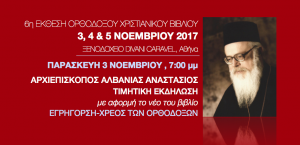 | Στο πλαίσιο της έκθεσης την Παρασκευή 3 Νοεμβρίου στις 7:00 το απόγευμα διοργανώνεται τιμητική εκδήλωση για τον Αρχιεπίσκοπο Τιράνων, Δυρραχίου και πάσης Αλβανίας κ. Αναστάσιο με αφορμή την κυκλοφορία του νέου του βιβλίου από τις εκδόσεις Εν Πλω με τίτλο: «Εγρήγορση, Χρέος των Ορθοδόξων», το οποίο και θα παρουσιάσουν οι ομιλητές: