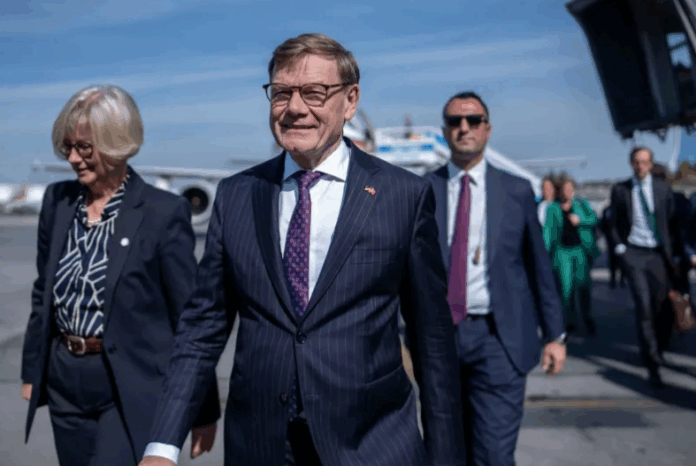 Ο Γιόχαν Γουάντεφουλ, Υπουργός Εξωτερικών της Γερμανίας, φτάνει για την επίσκεψή του στην Τουρκία και διασχίζει τον διάδρομο του αεροδρομίου. Το επίκεντρο της συνάντησης με τον Τούρκο ομόλογό του περιλαμβάνει τις προσπάθειες εφαρμογής του ειρηνευτικού σχεδίου για τη Γάζα, καθώς και την κατάσταση στην Ουκρανία και τη Συρία. Michael Kappeler/dpa