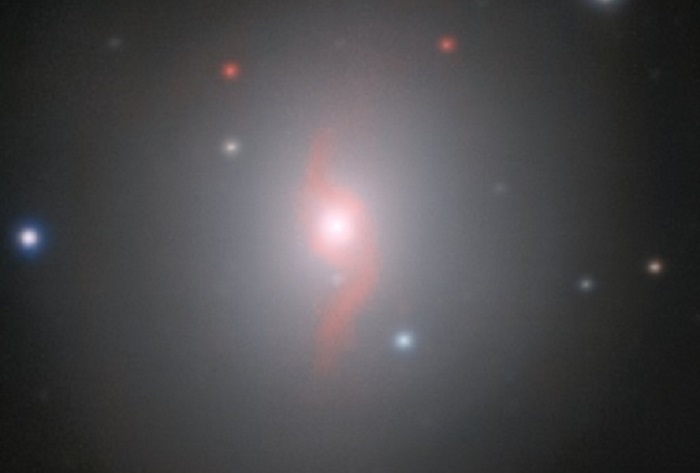 Ο γαλαξίας NGC 4993, περίπου 130 εκατομμύρια έτη φωτός από τη Γη. Το kilonova (εκπομπή ηλεκτρομαγνητικής ακτινοβολίας από την ευρύτερη περιοχή για μεγαλύτερο χρονικό διάστημα) είναι πάνω και ελαφρώς στο αριστερό κέντρο του γαλαξία. Το όργανο MUSE επιτρέπει να είναι ορατή η εκπομπή λαμπερού αερίου το οποίο εμφανίζεται με κόκκινο χρώμα εδώ και αποκαλύπτει μια εκπληκτική δομή σπειροειδούς. (ESO / J.D. Lyman, Α. J. Levan, Ν.Ρ. Tanvir)