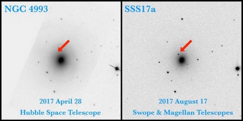 Η εικόνα στα αριστερά, που λήφθηκε από το τηλεσκόπιο Hubble, δείχνει τον γαλαξία NGC4993 τον Απρίλιο. Η εικόνα στα δεξιά απεικονίζει τον ίδιο γαλαξία στις 17 Αυγούστου. Η τελεία στην επάνω αριστερή γωνία του γαλαξία είναι η θέση της σύγκρουσης αστέρος νετρονίων (φωτ.: Swope Supernova Survey μέσω της UC Santa Cruz)