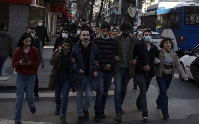 Αντικυβερνητική διαδήλωση των φοιτητών στην Αγκυρα. Η αντίδραση των νέων κατά της πολιτικής του Ερντογάν φουντώνει όλο και περισσότερο. (ASSOCIATED PRESS)
