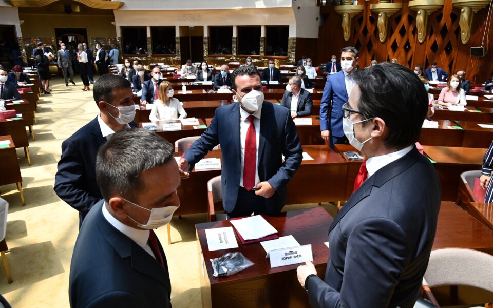 Ο Ζόραν Ζάεφ στηρίζεται σε 59 βουλευτές του κόμματός του κι εκείνου του Αλι Αχμέτι, αλλά του χρειάζονται τουλάχιστον δύο για να συγκροτήσει πλειοψηφία, γι’ αυτό πολιορκεί στενά το αλβανικό κόμμα «Εναλλακτική». (A.P. PHOTO)