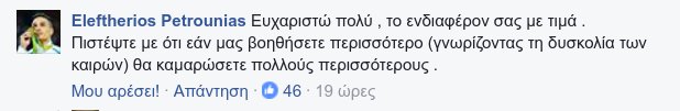 Ο χρυσός Ολυμπιονίκης έγραψε κάτω από την ανάρτηση του πρωθυπουργού στο Facebook: «Ευχαριστώ πολύ, το ενδιαφέρον σας με τιμά. Πιστέψτε με ότι εάν μας βοηθήσετε περισσότερο (γνωρίζοντας τη δυσκολία των καιρών) θα καμαρώσετε πολλούς περισσότερους».