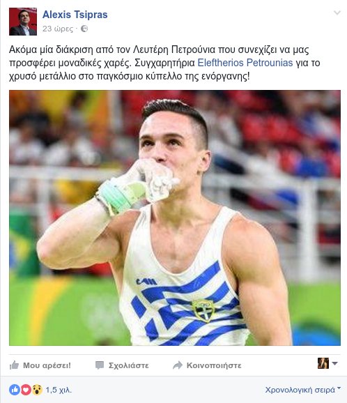 Στην ανάρτηση του ο Αλέξης Τσίπρας έγραψε: «Ακόμα μία διάκριση από τον Λ. Πετρούνια που συνεχίζει να μας προσφέρει μοναδικές χαρές. Συγχαρητήρια για το χρυσό στο παγκόσμιο της ενόργανης!».