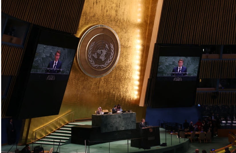 Καθώς ο Μακρόν μιλούσε τη Δευτέρα, η θέση του Ισραήλ στη Γενική Συνέλευση παρέμενε εμφανώς άδεια.