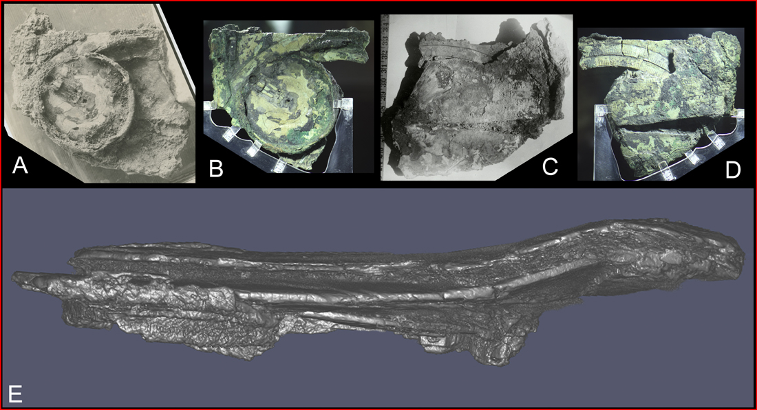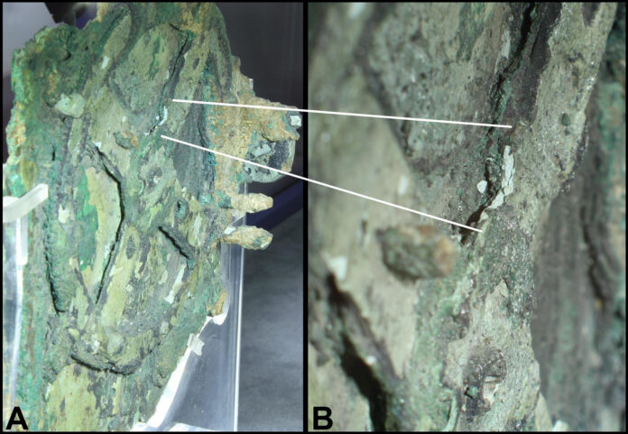 Φωτογραφία:Αριστερά: Φωτογραφία της κεντρικής περιοχής του Θραύσματος Α απεικονίζει το γρανάζι b1 με τους τέσσερις βραχίονές του. Δεξιά: στιγμιότυπο από το τυχαίο σπάσιμο σε τμήμα του ενός βραχίονα. Στο εσωτερικό του βραχίονα δεν διασώζεται κανένα ίχνος μπρούντζου και έχει αντικατασταθεί από τον Ατακαμίτη (Voulgaris et al., 2022).